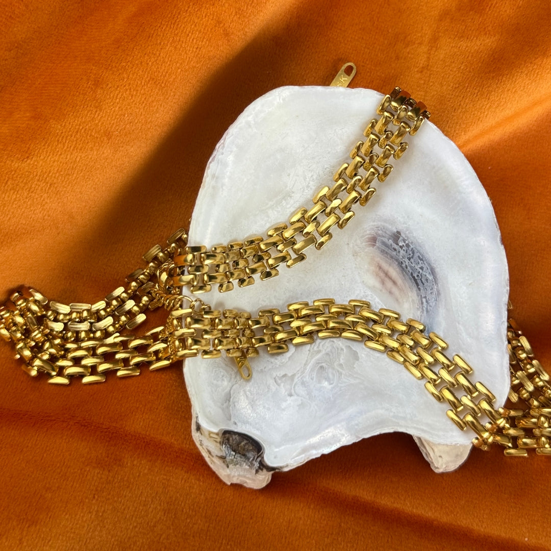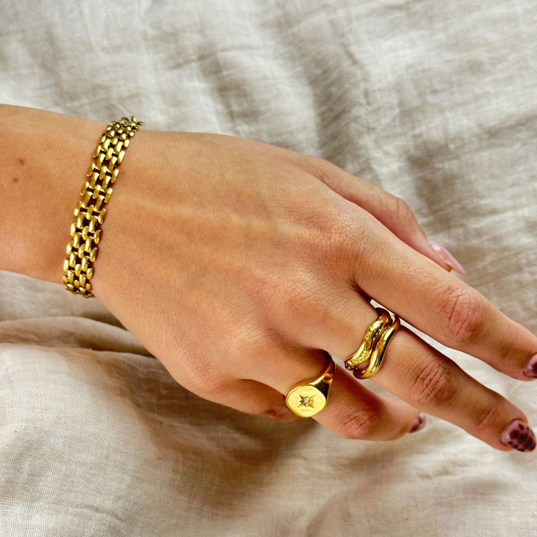 Cleo Armbåndet kombinerer karakter og finesse med sit tætte, dobbeltrækkede led-design i 18K guldbelagt stål. De afrundede, strukturerede led giver et markant og sofistikeret udtryk.