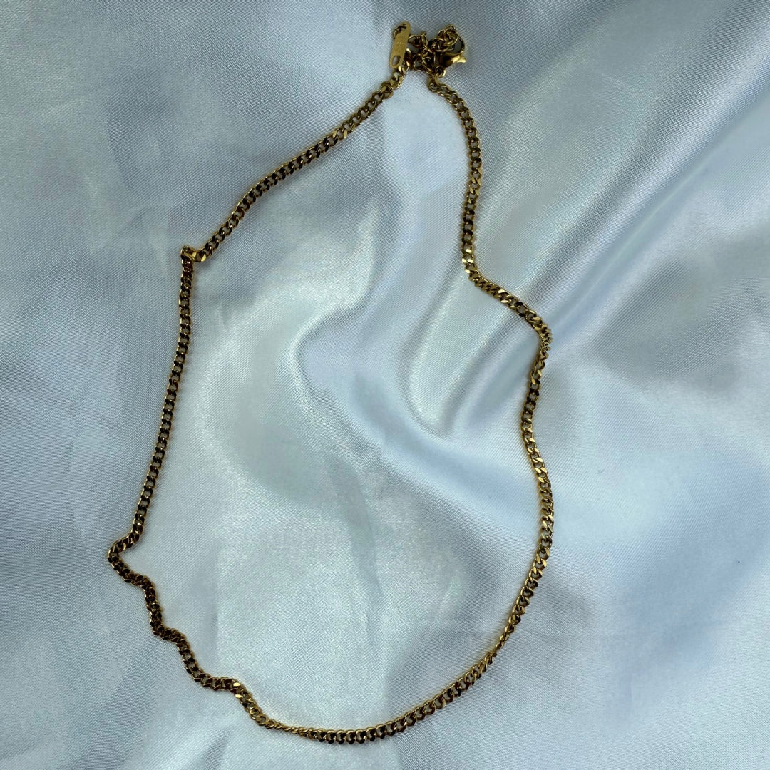 En klassisk kæde med tæt flettede led og et balanceret udtryk, udført i 18K guldbelagt rustfrit stål. Designet er glat og poleret med en flad struktur, der lægger sig elegant mod huden. Halskæden har justerbar længde og lukkes med karabinlås. Et enkelt og stærkt element, der fungerer alene eller i kombination med andre kæder.