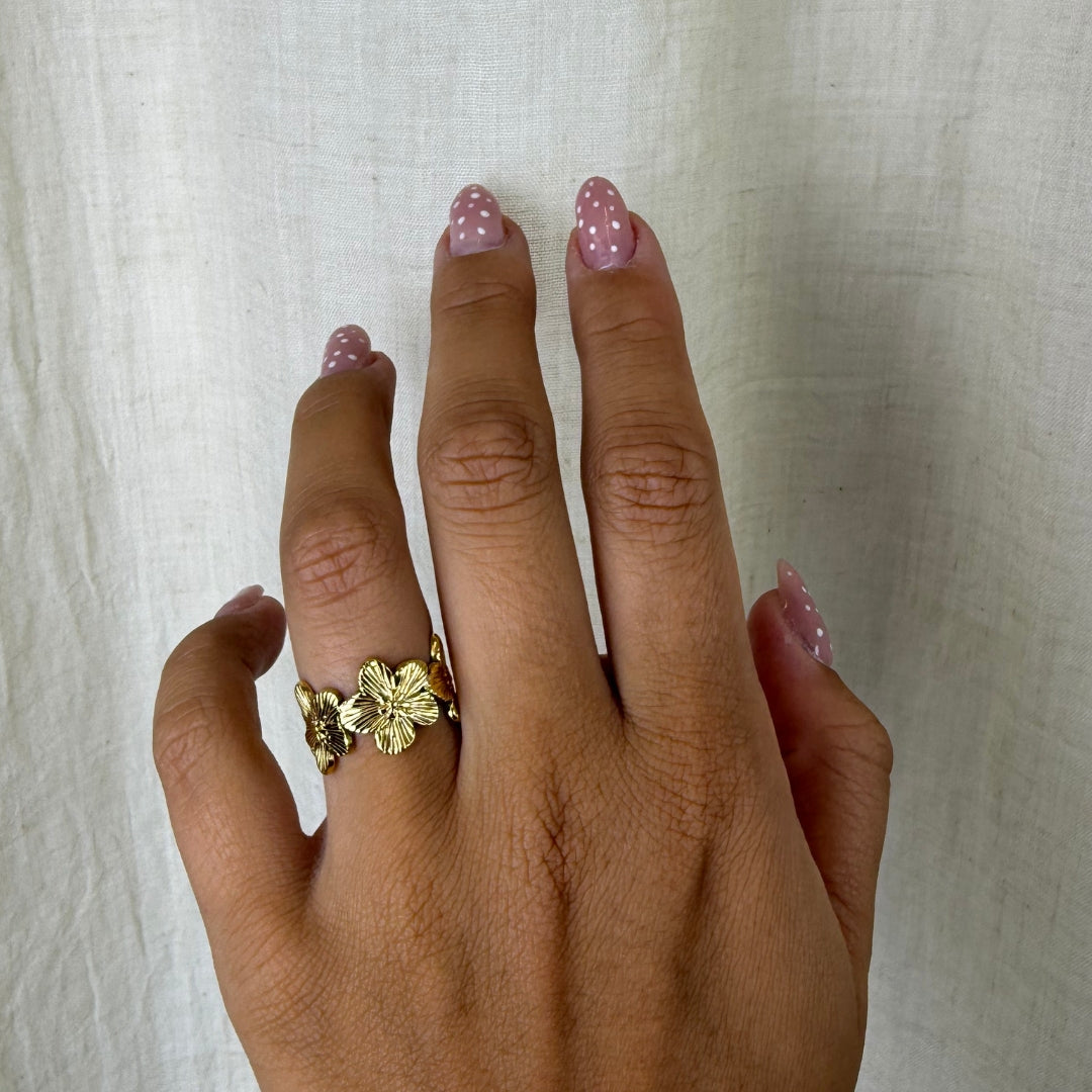 En dekorativ ring med blomsterformede elementer hele vejen rundt, udført i 18K guldbelagt rustfrit stål. Hver blomst er detaljeret med fine linjer og en let struktureret overflade, der giver ringen et levende og feminint udtryk. Den åbne bagside sikrer fleksibilitet og komfort. Et smykke med tydelig naturinspiration og romantisk karakter.