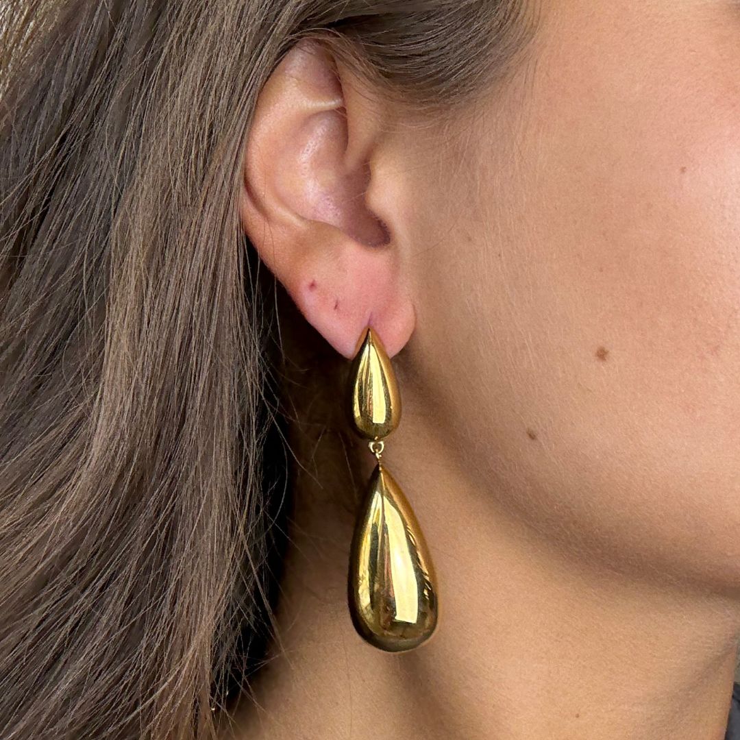 Skulpturelle øreringe med et flydende formsprog, udført i 18K guldbelagt rustfrit stål. De dobbelte dråbeformer er samlet med diskret led og skaber et roligt, balanceret bevægelsesflow. Den spejlblanke overflade fremhæver det bløde design og giver et markant, afrundet udtryk. Øreringene har en let kurvet silhuet, der tilfører volumen uden at virke tunge. Et formstærkt valg med sans for detalje og form.