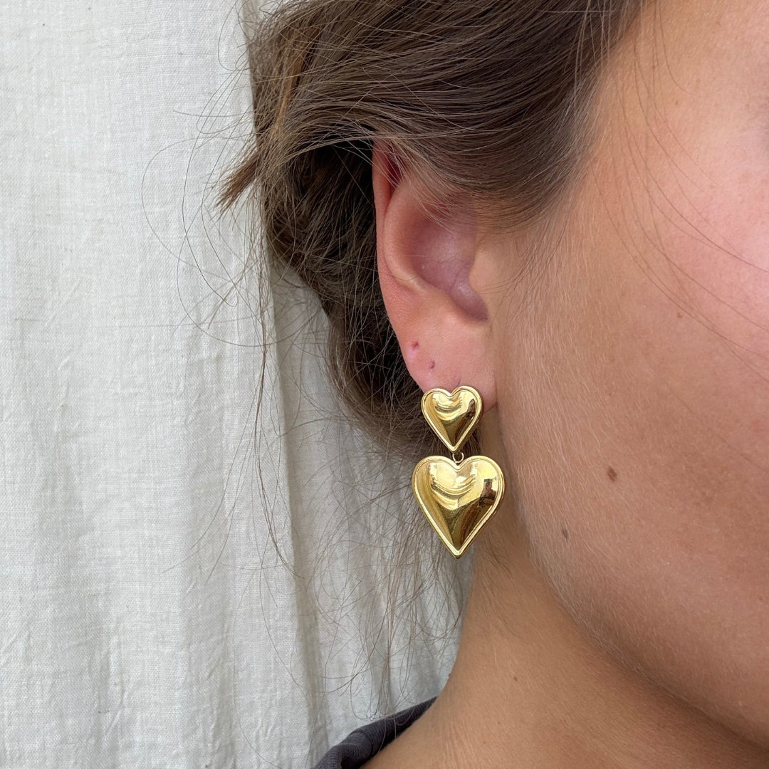 Heart Drop Øreringe 18K Guldbelagt kombinerer romantik med iøjnefaldende elegance. Designet med to blankpolerede hjerter i forskellig størrelse, skaber de et legende og feminint udtryk med bevægelse og glød.