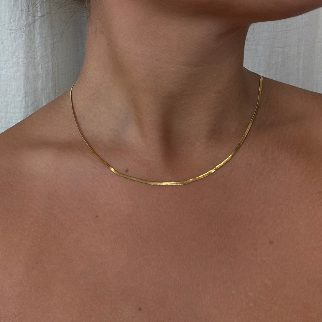 Sienna Snake Halskæden har en glat og fleksibel silhuet, der smyger sig elegant om halsen med et blankt, næsten flydende udtryk. Den flade, tætte kædestruktur reflekterer lyset smukt og skaber et luksuriøst look med kant. Halskæden er 18K guldbelagt og fungerer perfekt alene eller i lag med andre kæder.