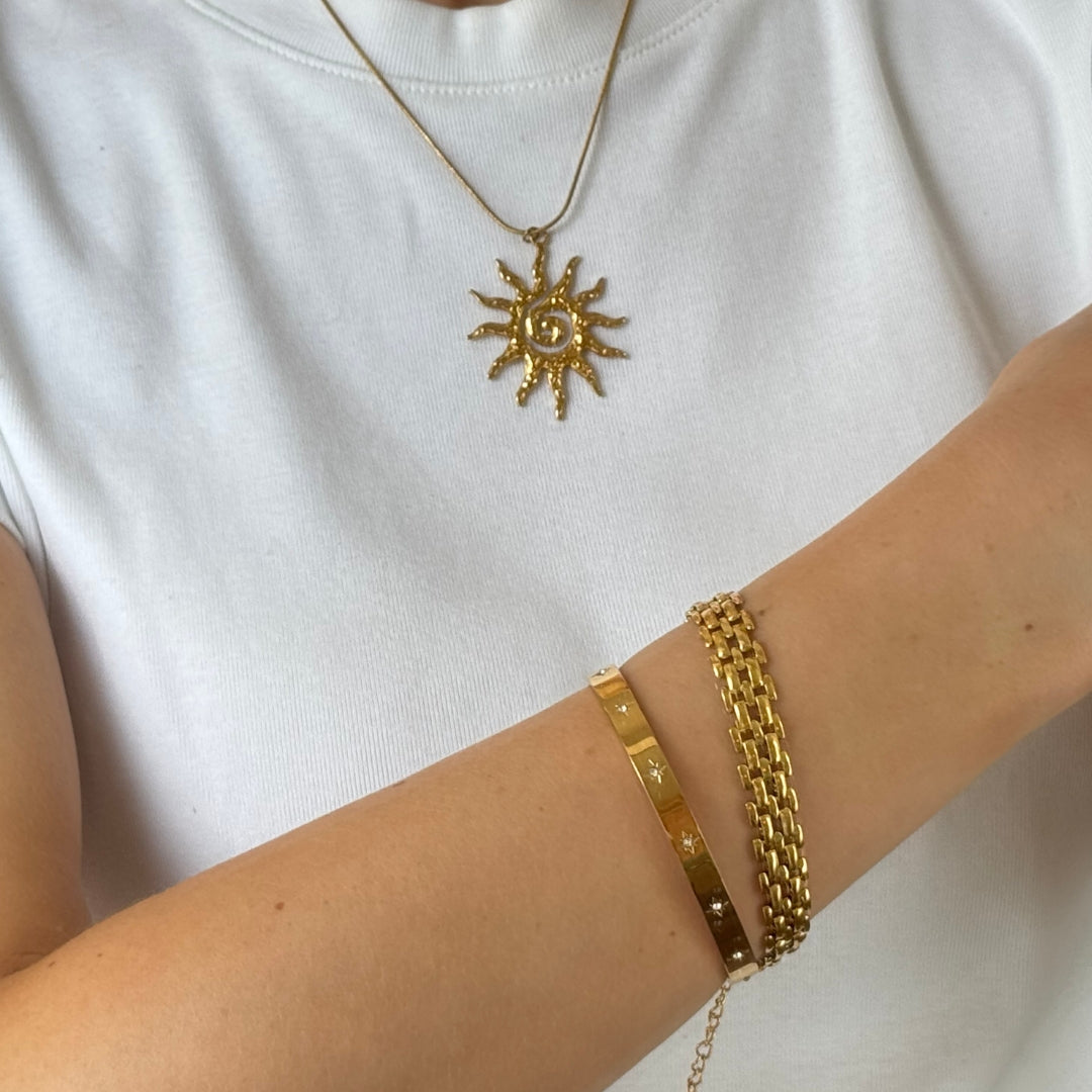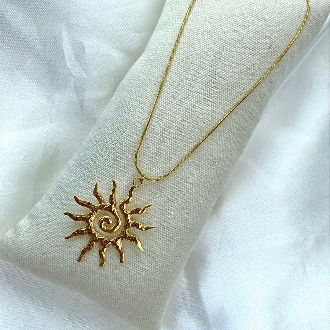 En karakterfuld halskæde med håndformet solvedhæng i spiralform, udført i 18K guldbelagt rustfrit stål. Vedhænget har en tekstureret overflade og organiske linjer, der giver smykket et råt og levende udtryk. Den fine kæde skaber kontrast til det markante vedhæng og balancerer designet. Et symbolsk smykke med energi og kraft i centrum.